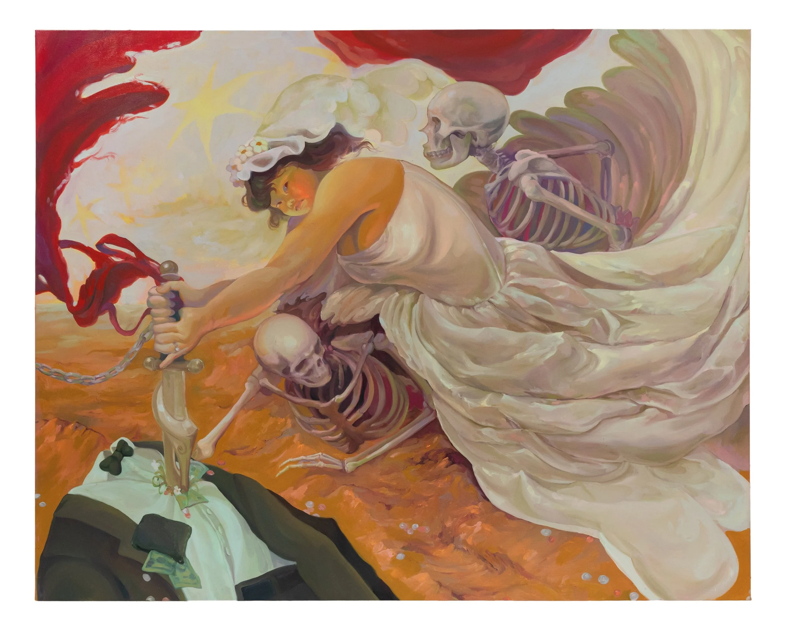 That Which Binds Us captures a moment both pivotal and defiant. At the center, a bride pierces her earthen groom, unleashing a swirling tornado of transformation. She is flanked by two skeletons, poised to reclaim her should she stumble. In a single, decisive gesture, she transcends the constraints of mortality, material pursuit, and societal expectation. All cycles collapse, replaced by boundless, untamed autonomy. In this universe, conviction is potent enough to bend the laws of nature—and perhaps even defy death itself.