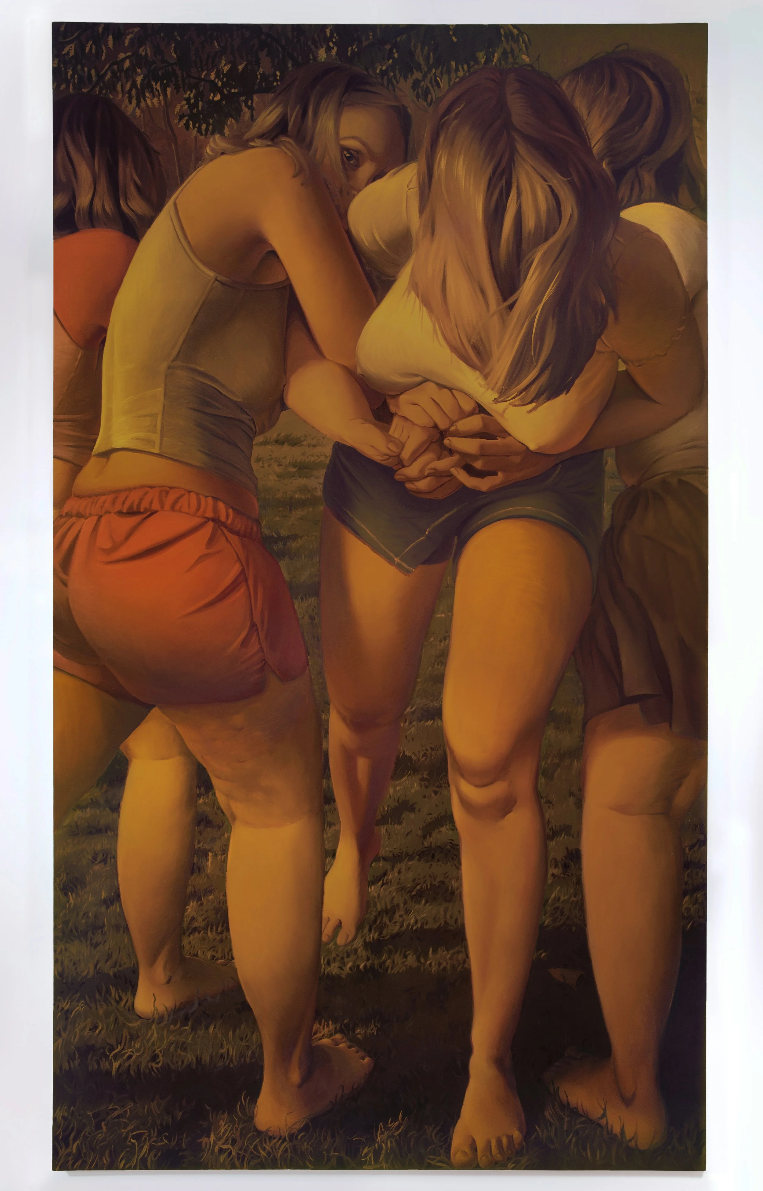 In Combat Games, Madsen depicts the childhood game of Red Rover with four players, focusing on the struggle and violence present in a traditional space of play. Both identification and isolation are present in different ways, due to the dichotomy of the self and the Other through the implied interior and exterior of the human wall. This is palpable within the frame and the force of the two figures holding the runner back while also supporting her, their hands form a visibly fragile point near the center of the painting.