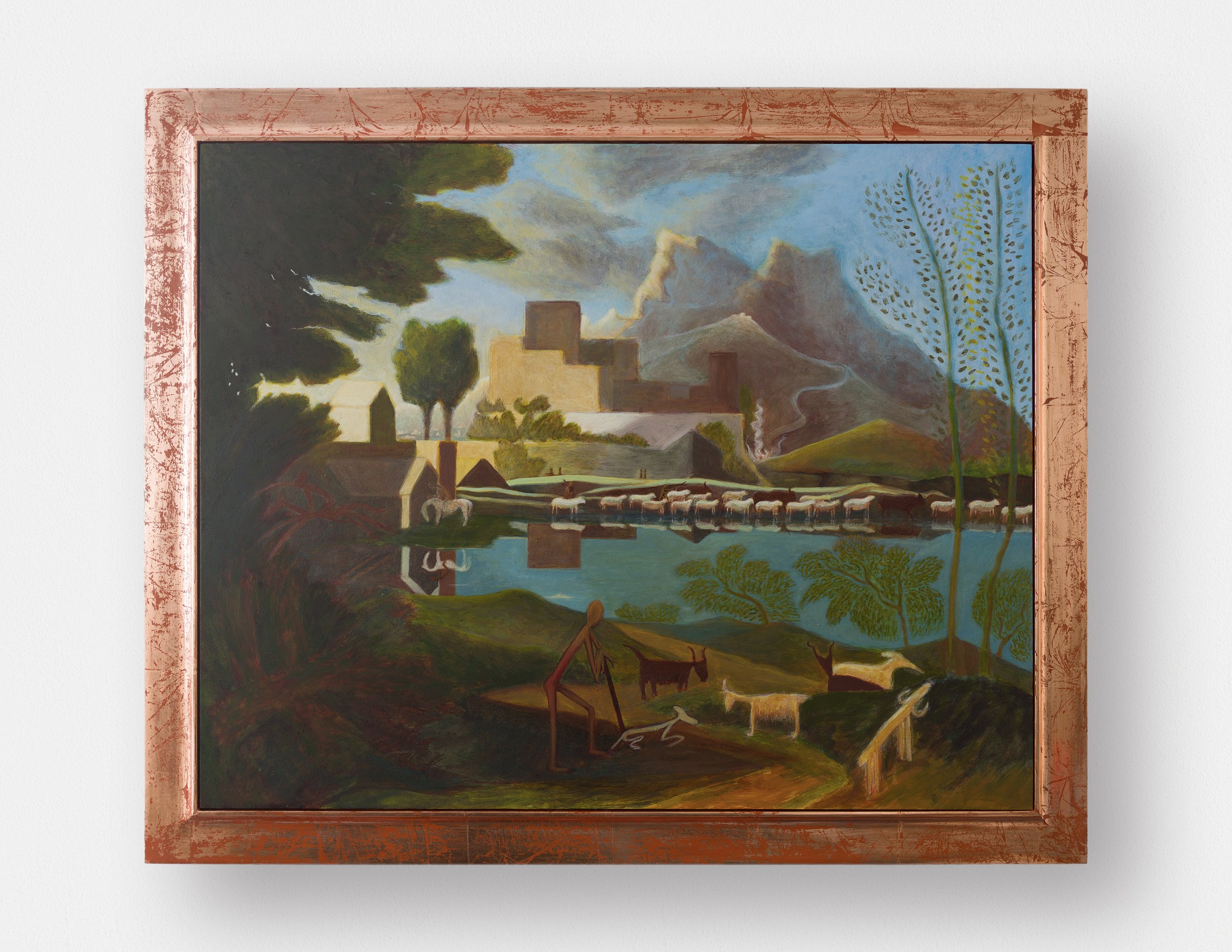 Damien H. Ding, Landscape with a Calm (Poussin), 2025-2026, egg tempera on linen laid on panel, gilded frame, 28.125 x 34.25 inches framed