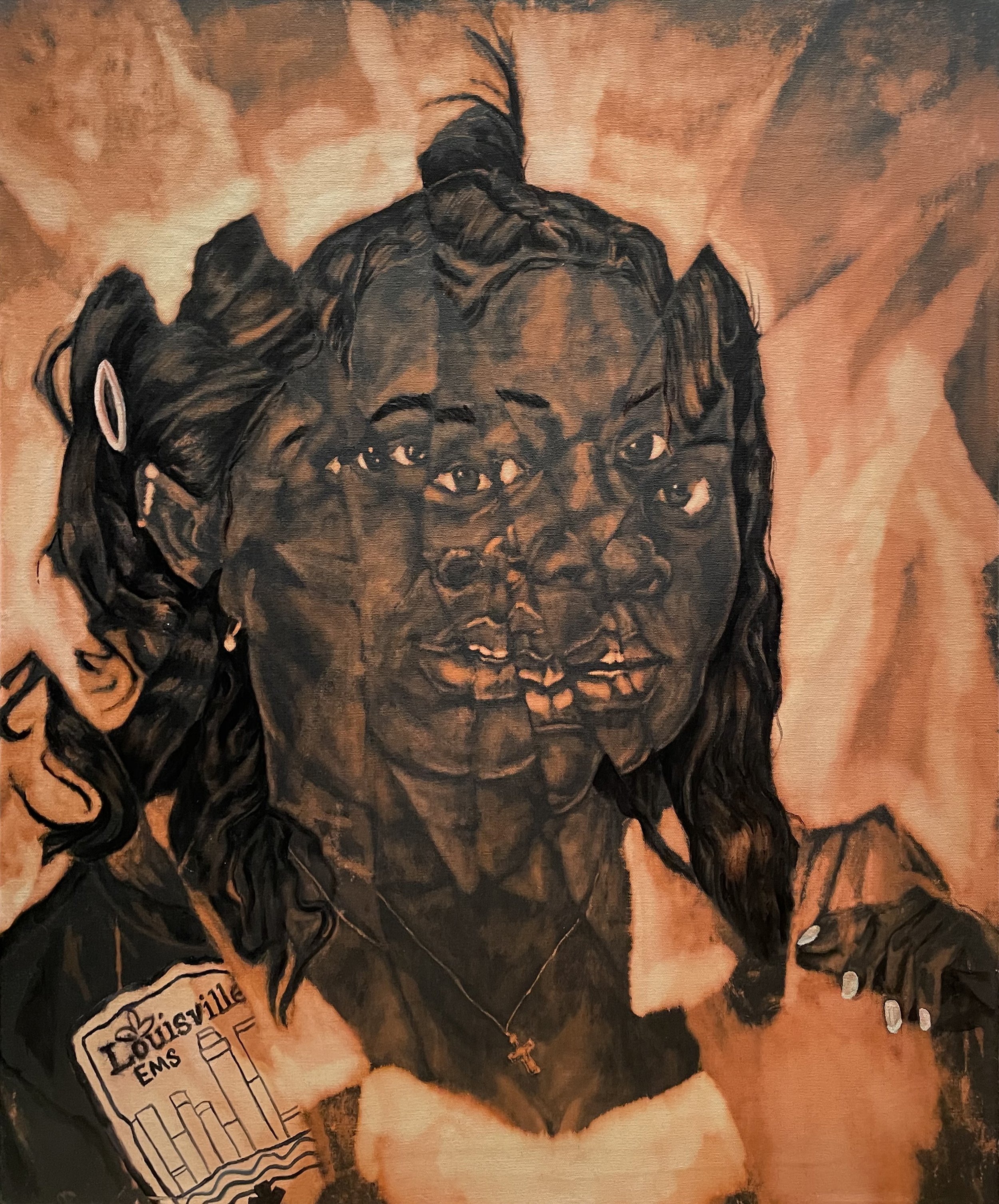 Say His Name: Jordan Davis 17, November 23, 2012, Jamee Johnson 22, December 14, 2019, Ryan Twyman 24, June 6, 2019, Botham Shem Jean 26, September 6, 2018, Tamon Robinson 27, April 18, 2012, 2021, bleach, oil stick and oil on canvas, 30 x 24 inches